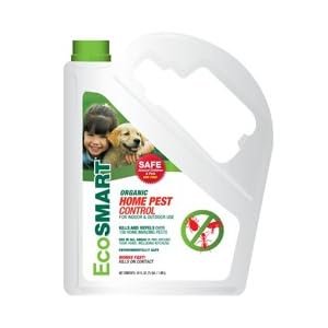 Ingredients: Active Ingredients: 2-Phenethyl Propionate ................................. 2.00% Rosemary Oil ............................................... 1.00% Peppermint Oil ............................................. 1.00% Thyme Oil .................................................... 0.50% Clove Oil ...................................................... 1.00% Other Ingredients*....................................... 94.50% Total ........................................................ 100.00% *Water, Potassium Oleate, Lecithins Description: Now there is an organic insecticide that is safe to use around children and pets and won't harm the environment. EcoSmart Organic Home Pest Control is a ready-to-use formulation made from a patented blend of organic plant oils. It kills bugs fast, without synthetic toxins or harmful residue. It's safe. It's effective. It's smart. Naturally. KILLS AND REPELS: Ants (including Carpenter, Red Harvester, Pavement and Argentine), Beetles, Centipedes, Cockroaches, Crickets, Earwigs, Fleas, Millipedes, Pantry Pests, Pillbugs, Silverfish, Spiders, Sowbugs, Ticks and other crawling insect pests. Application Recommendations: BEFORE APPLYING PRODUCT: If applying in pantry area, it is recommended to remove items from pantry to allow best access. If applying outside as a barrier treatment, remove debris and leaf litter from around the foundation, cut back vegetation and branches that touch the foundation and remove or rake back deep mulch, rocks or other potential pest harborage sites next to the foundation.