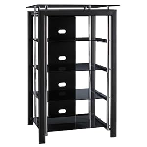 Part of Bush Furniture's sophisticated Midnight Mist entertainment collection, this audio tower provides a striking modern display for stereo components, peripherals, and accessories. Five black, tempered-glass shelves are housed inside a unique double frame with wide, textured-black painted posts on the outside and narrow chrome-finish poles that rise up from within. (Notice how the staggered design gives the top level a floating effect.) The shelves rest on vibration-dampening pads for improved sound quality, and a perforated back spine provides both extra stability and wire concealment. The tower measures 25-5/8 inches wide by 22-3/8 inches deep by 41-3/4 inches high and has been tested for tip-free safety. Assembly is required, and instructions and a toll-free customer help line are included. Six-year warranty. --Kara Karll When only ultra-contemporary will do, Midnight Mist's sleek open architecture offers maximum appeal.