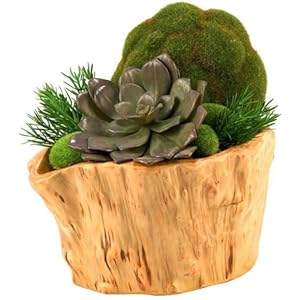 This interesting piece offers an array of different textures and vivid, lifelike colors that will instantly update the look of your space with eye-catching appeal. With a beautiful planter that looks like a hollowed tree stump, this faux greenery arrangement will look great on any end table, wall shelf, bookcase or even on the buffet in your dining room. Place your order today. Made of durable synthetic materials for years of lasting beauty. Meticulously crafted to create realistic, lifelike beauty. Actual size is 9"Hx9"W